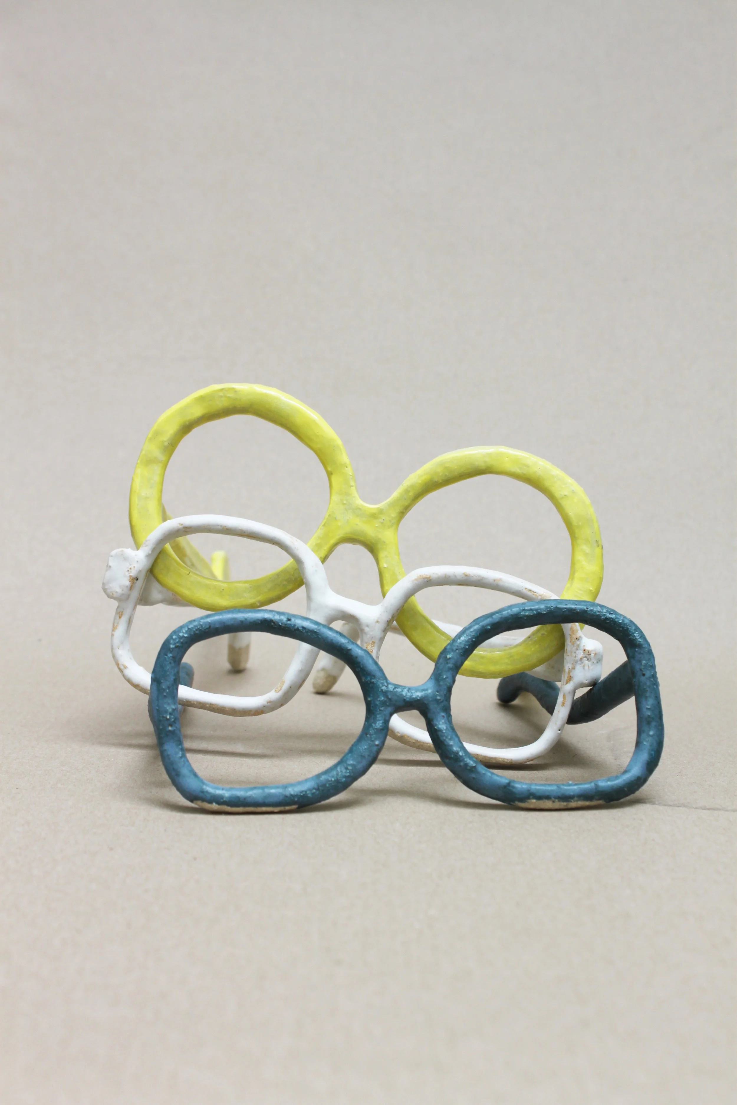 Objet contemporain, ces lunettes façonnées à la main sont en grès. J’ai tiré mon inspiration de photos et de paires au look extravagant qu’elle m’a légué. Chaque objet est unique et numéroté.
